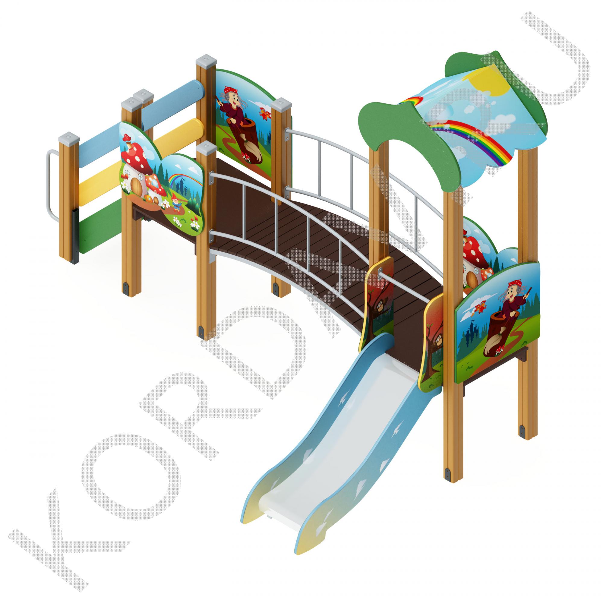 Комплекс ПДИ 1.17 для игр детей 3-7 лет состоит из: двух башен, маленькой лестницы, горки, четыре ограждения для башен, дугообразный мост и ограждение для моста. Металлические элементы имеют закругленную форму, все швы тщательно обработаны. Все стальные детали окрашены порошковой краской, стойкой к коррозии и атмосферным осадкам, а закладные части покрыты двумя слоями краски. Деревянные части ПДИ 1.17, подверженные воздействию осадков покрыты полиуретановой краской, на остальные изделия из фанеры нанесена акриловая водно-дисперсная краска.